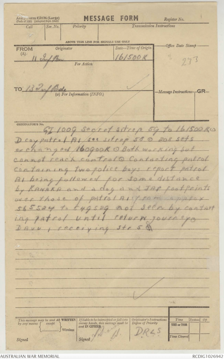We researched the question and proceeded to review the 11th Battalion and 5th Division files for February, April, May and June 1945 in the Australian War Memorial digital archives to see whether a handwriting match could be found. Several likely matches were soon realised. Most of the signal forms were written as “SITREP’s” (SITuation REPorts). These reports are, in the main, handwritten and non-cursive at the battalion-unit level, and it soon became clear in the review, that out of several people writing reports on signal forms, one person’s distinctive style matched the handwriting on the map edge. It appears that Army policy was that a SITREP when written (or typed) on signal forms, had to be signed in a cipher or “as-written” authorisation square (one of two boxes on the message form) by an officer-in-charge, which makes sense as confusion or a security breach would arise if an unchecked or unauthorised personnel wrote, issued or mis-directed signal messages.
