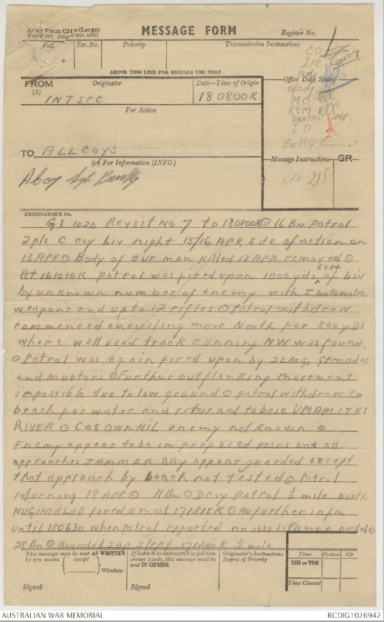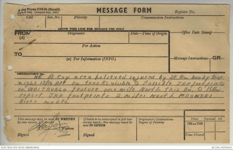 Another fine example of fitting writing was on a signal form with a “SITREP 59” reference, in the AWM April 1945 file. This message is the reference to GI 1009 message number seen on the Electra map notation, and aligns to that writing style. This message was signed by Lieutenant Brown. However, again, Lieutenant Brown did not write the content of the message; he merely reviewed and approved it. A few other officers appeared in signature blocks on various messages throughout the months but Blackie and Brown were the most prominent for the 11th Battalion messages.