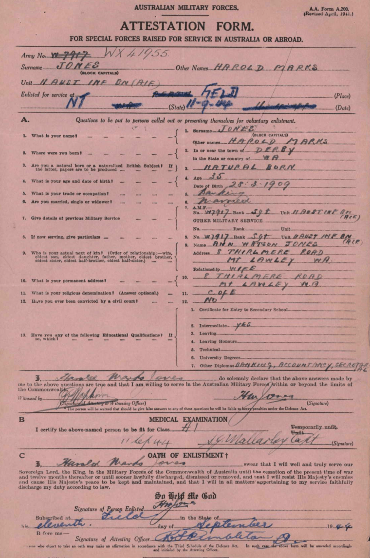 With a personnel Service Number it was a simple matter to insert the number into a search in the Australian National Archives and WX41955 revealed the “Attestation Form” completed by Harold Marks Jones when he re-enlisted into the Australian Army on 11th September 1944 at the age of 35. Harold Jones had previously served in the Army and had attained the rank of sergeant with the Service No. W 7917. HM Jones signed this Attestation document in two places and the signature matches the signature on the AWM April 1945 file documents that were compared. Harold Marks Jones was given the new “WX” number 41955 and his previous service rank of sergeant and sent off to join his old 11th Battalion again, just in time to embark for Jacquinot Bay, New Britain Island.
