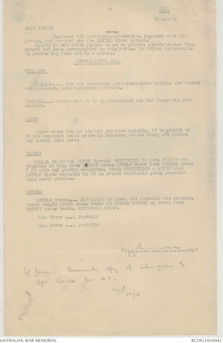 By the date 24 May 1945, the original issue “October 1943” version of the MEVELO map had been re-issued (new map) as a “January 1945” edition with red overprints showing corrected detail and therefore the 1943 -issue map which contains the handwriting on the lower margin was a “superceded” version and basically in a wartime situation “waste paper” and should have been tagged for destruction but Sgt. Jones still had a copy and wrote on the lower border. On 16 May Lieutenant Hopkins returned and was now back in the I.O. seat. Did Sgt. Jones still see it as his duty to inform Captain Mott? Was it his intention to send the map to Captain Mott but did not do so because Captain Mott had left the area? If information came in from the U.S. Army on the 24 May 1945 as per the date in the writing on the map that leaves two days before Captain Mott departed by barge for Jacquinot Bay on 27th May as he was returning to his post at the intelligence group at 5th Division HQ. It is not known if Sgt. Jones managed to get a message to him before he left.
